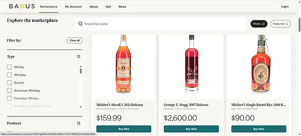 BAXUS хранит высококачественные напитки (такие как редкий виски и вино) в безопасных хранилищах с контролем температуры, для каждой бутылки напитка создается уникальный NFT с помощью технологии блокчейн, который служит цифровым сертификатом права собственности, фиксируя происхождение, сертификацию и историю транзакций бутылки. Также предоставляется рынок, подобный Opensea, который позволяет пользователям непосредственно торговать редкими алкогольными напитками и поддерживает традиционные способы оплаты, такие как USDC и кредитные карты.