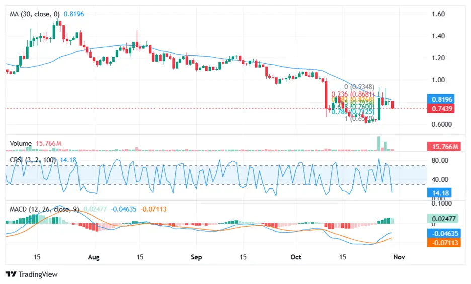 Трейдерам следует следить за ежедневными закрытиями относительно этих ключевых уровней, так как закрытие выше $0.84 может ознаменовать начало возобновления бычьего импульса, в то время как неспособность удержаться выше 7-дневной скользящей средней на уровне $0.735 может спровоцировать повторный тест поддержки около $0.63.