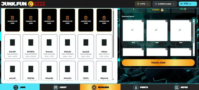 Пользователи могут уничтожать «Обнулённые MEME, пассивно полученные мусорные аирдропы, NFT» на Junk.Fun, получая за это SOL. После уничтожения пользователь получает Credits на платформе Junk.Fun.