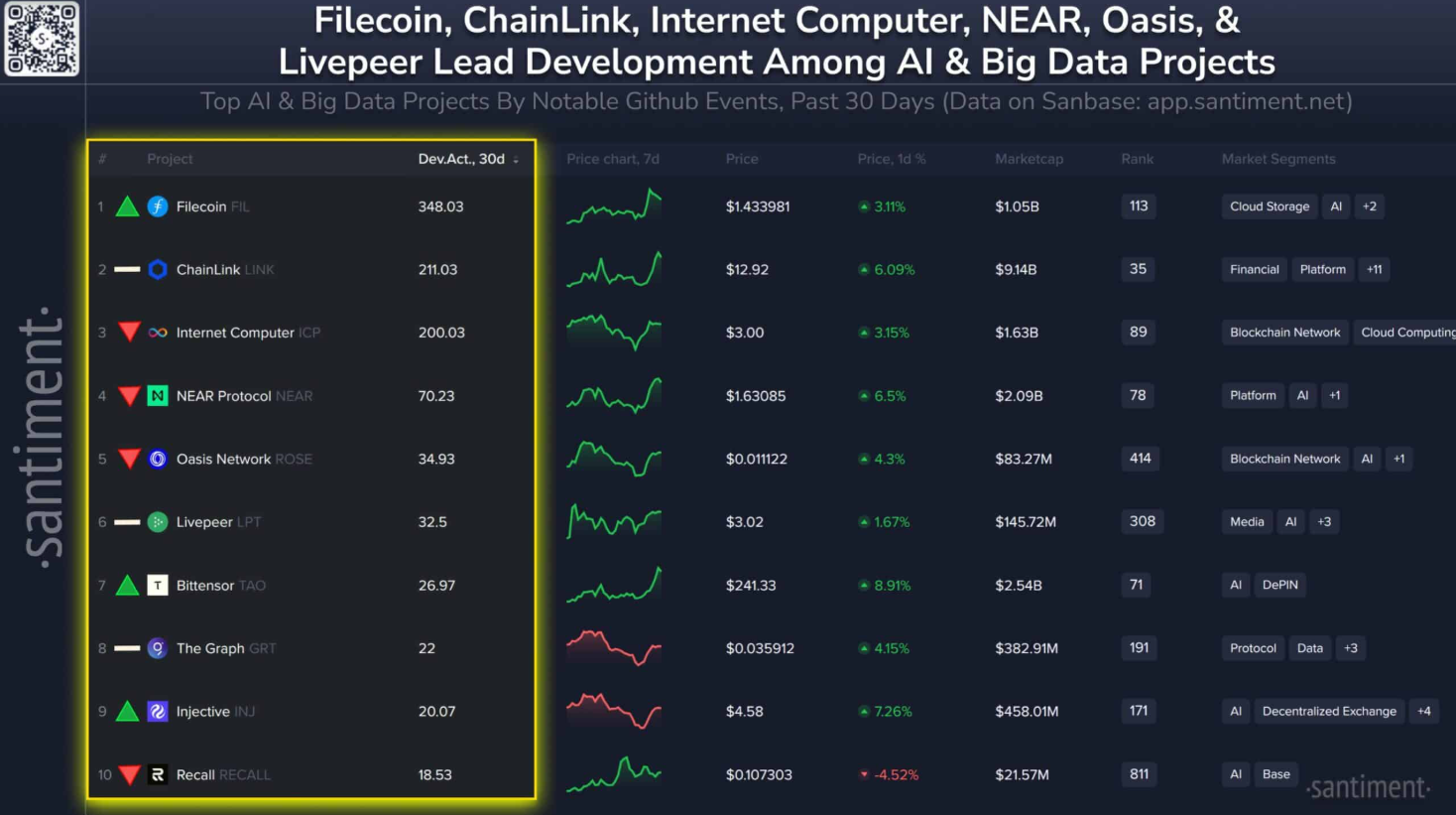 Filecoin (FIL) в настоящее время лидирует среди токенов, связанных с ИИ и большими данными по уровню активности разработки, согласно информации Santiment в публикации на платформе X. Следом идет Chainlink (LINK), а на третьем месте — Internet Computer (ICP).