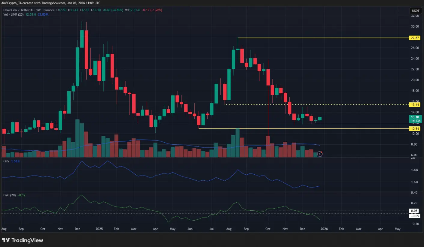 Еженедельный график LINK/USDT | Источник: TradingViewДля LINK структура колебаний на недельном таймфрейме остается бычьей, что подтверждается сильным ростом с июня по август 2025 года. Однако внутренняя структура на том же таймфрейме указывает на нисходящий тренд, а сигналы по объему продолжают отражать преимущество медведей.
