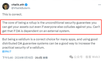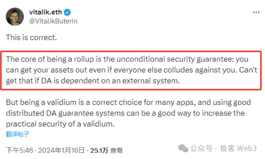 16 января 2024 года в твите, инициированном Дэниелом Вангом, основателем проекта Ethereum Layer 2 Taiko, и взаимодействующим с Цзэн Цзяцзюнем, основателем кошелька AA Soul Wallet, Виталик сказал: «Ключом к Rollup является безусловная безопасность: даже если на вас нацелены все, и вы все равно можете забрать активы. Это невозможно сделать, если DA полагается на внешнюю систему (за пределами Ethereum)».
