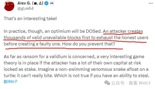 Но, напротив, **проблемы с доступностью данных также связаны с экономическими проблемами, которые необходимо решить. **Основатель ZkSync отметил во время битвы с техническим директором Arbitrum, что **проблемы с доступностью данных теоретически уязвимы для DoS-атак. **Например, секвенсор быстро освобождает тысячи обязательств DA в цепочке, а затем удерживает соответствующие полные данные, не освобождая их. Таким образом он может истощить все средства претендентов, а затем выдать недействительную блокировку, украв активы пользователя.