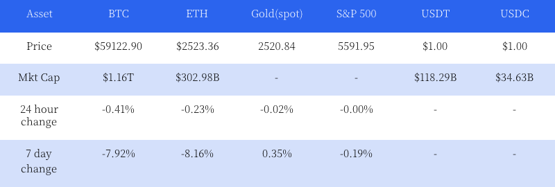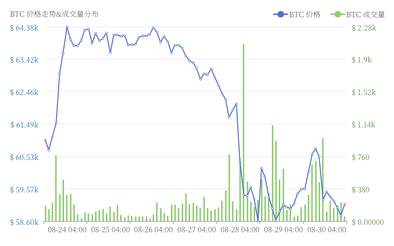 Цена BTC на этой неделе составляет 2,14% волатильности. Цена BTC на этой неделе показывает тенденцию сначала расти, а затем падать, достигнув наивысшей точки около 65 000 долларов в начале недели, временами снижаясь до около 57 800 долларов в середине недели, затем в конце недели немного возрастает и остается на уровне около 59 500 долларов.