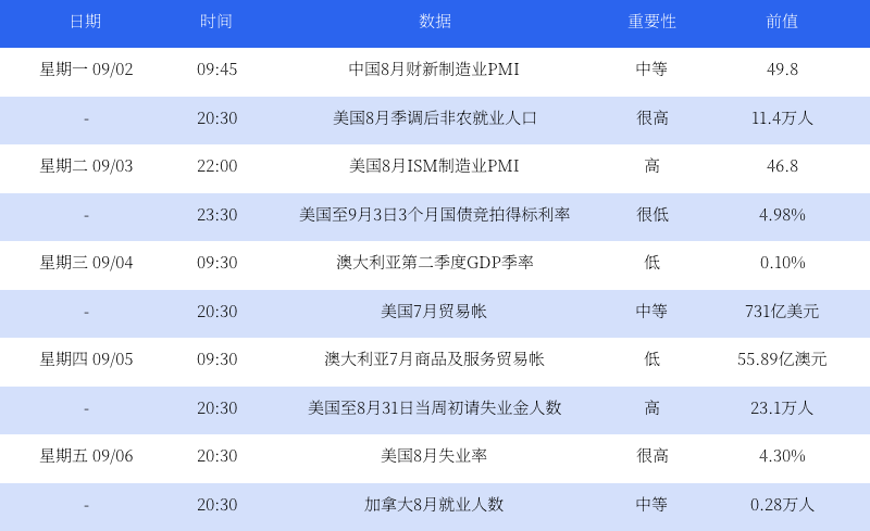 С точки зрения важности, данные о количестве рабочих мест и уровне безработицы в США в августе являются самыми важными данными на этой неделе, за ними следует PMI в производственном секторе ISM. Важность данных о PMI в производственном секторе Китая и ВВП Австралии ниже. Кроме того, аукционы государственных облигаций США и торговые данные также повлияют на движение рынка.