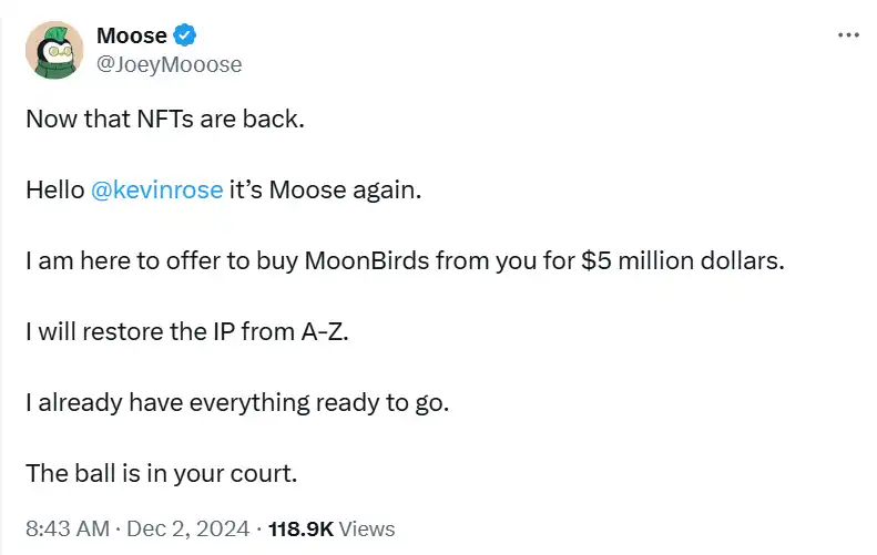 Но, вероятно, он шутит, потому что вчера он заявил, что собирается потратить 5 миллионов долларов на покупку MoonBirds у Кевина Роуза. Но, парень, MoonBirds уже купила компания Yuga Labs…