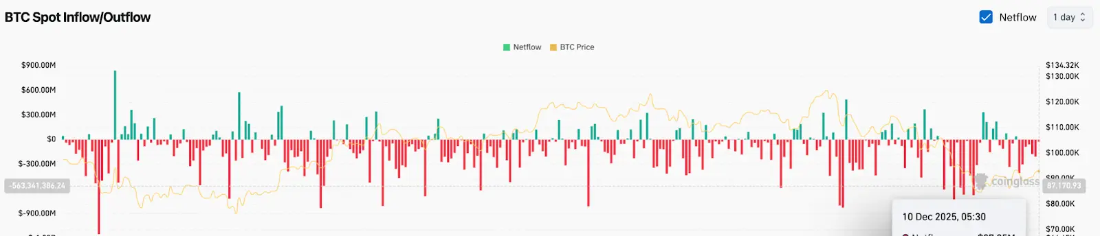 Обменные потоки остаются отрицательными. Данные Coinglass показывают примерно $27 миллионов чистых оттоков в начале сегодняшней сессии. Оттоки доминируют уже несколько недель, подтверждая, что предложение продолжает возвращаться на биржи, а не в долгосрочные хранилища.