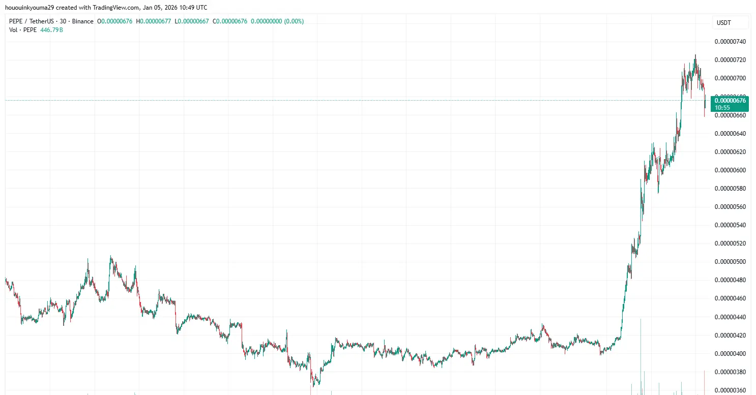 PEPE начал 2026 год с взлета, цена мемкойна выросла более чем на 60%, значительно превзойдя все криптовалюты из топ-50 по рыночной капитализации. В разгар ралли актив достиг $0.00000725 в воскресенье, но с тех пор произошел откат до $0.00000676.