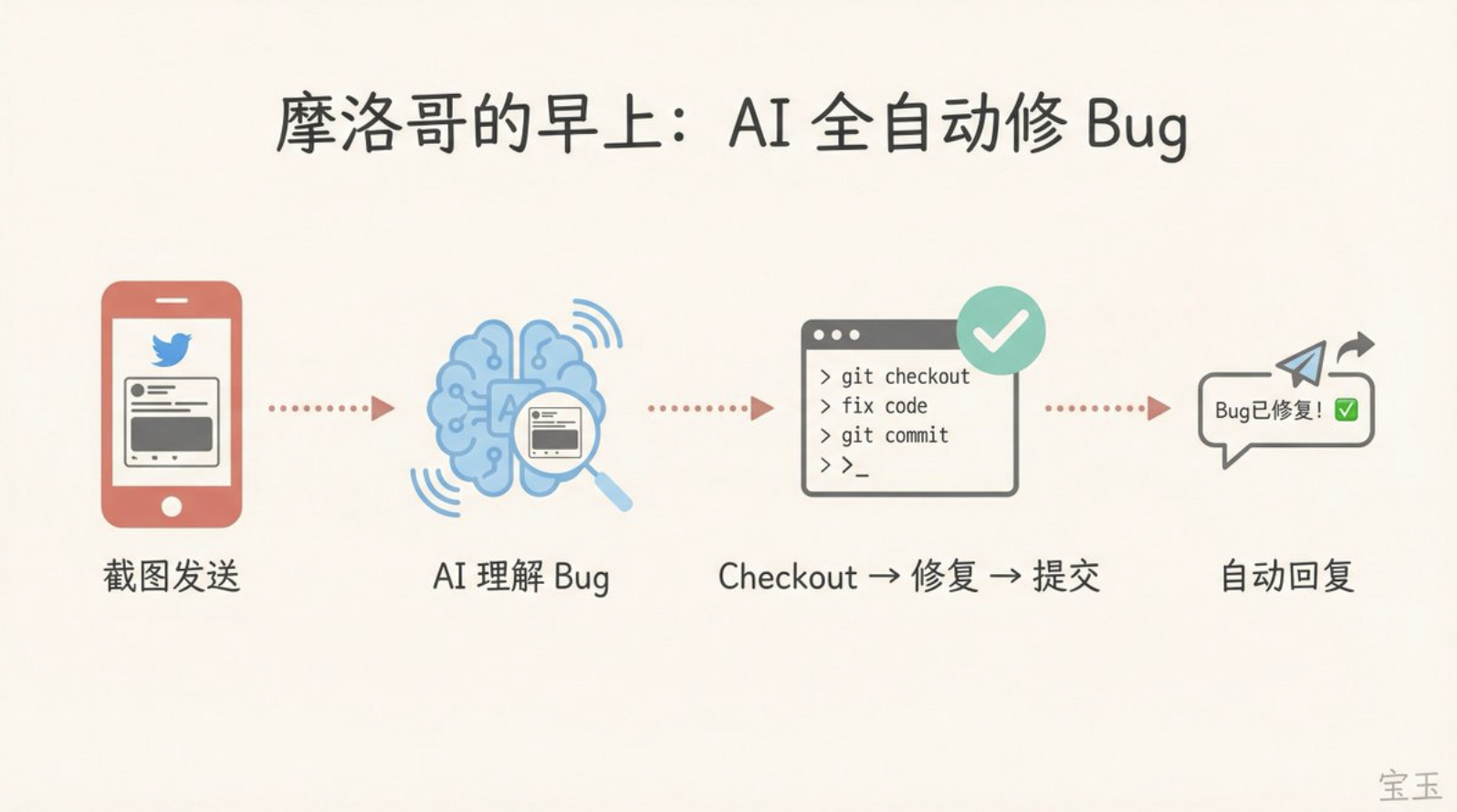 AI อ่านเข้าใจเนื้อหาทวีต รู้ว่านี่คือรายงานบัค มันเช็คเอาท์โค้ดจาก Git ที่เกี่ยวข้อง แก้ไขปัญหา ส่งโค้ดเข้าไป แล้วตอบกลับบน Twitter ว่าแก้ไขเสร็จแล้ว