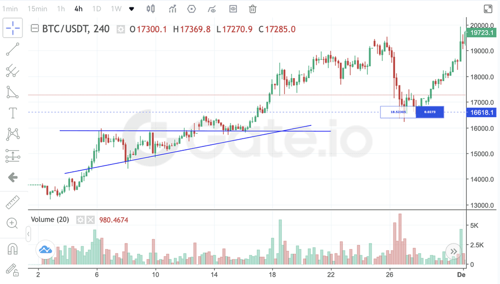 Grafikte Gate vadeli işlem çifti BTC/USDT için 4 saatlik mum çubuğu gösteriliyor. 5-12 Kasım 2020 arasında, BTC fiyatının 13.500 ABD Dolarından yaklaşık 15.800 ABD Dolarına yükseldiği ve ardından bir dalgalanma döneminin yaşandığı yükselen bir üçgen belirgindir. Formasyon oluşturulduktan sonra üst kenarı 16.000 dolardan kırıldı ve bu da önemli bir yükseliş dalgasına yol açtı.