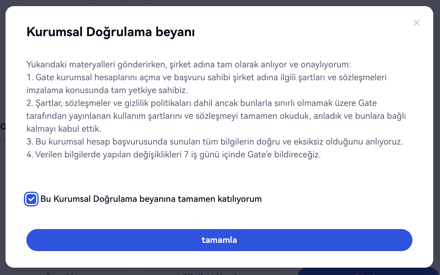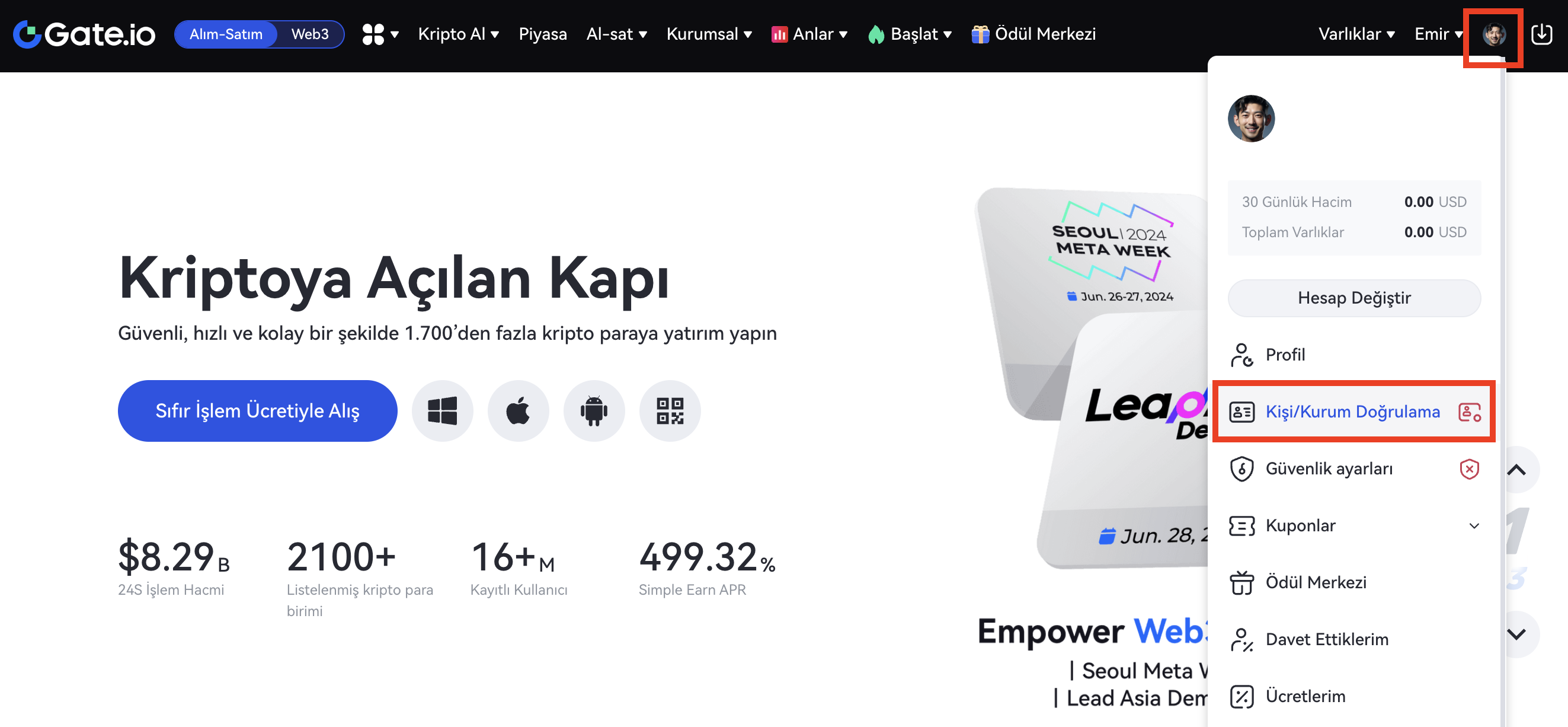 Gate hesabınızda oturum açın. İmlecinizi sağ üstteki profil simgesine getirin ve "KYC (Kimlik Doğrulama)" - "Kuruluş" - "Şimdi Doğrula"ya gidin.