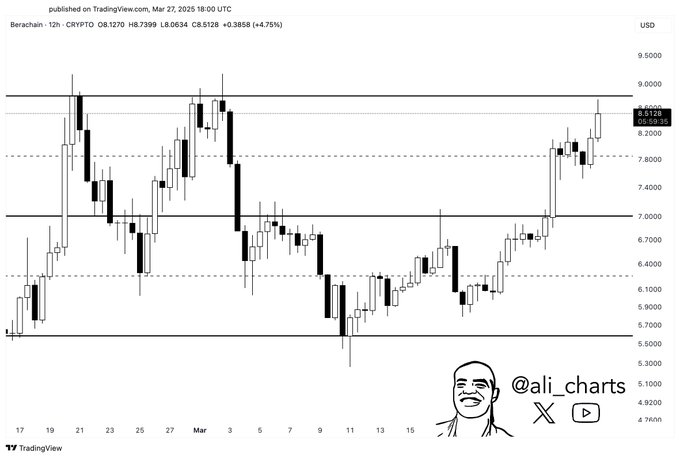 Source: Ali Martinez/XBerachain, whose mainnet was launched early last month, is trading at $8.23 at time of writing.