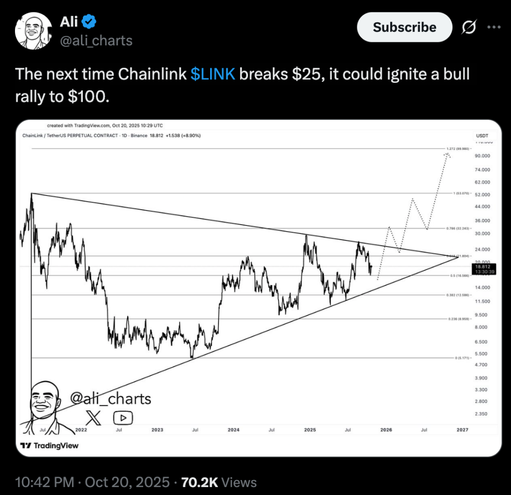 Analistler de dikkatle izliyor. Bir piyasa analisti olan Ali Martinez, $25 üzerinde bir kırılmanın büyük bir şeyin başlangıcı olabileceğine inanıyor. Chainlink fiyatı, momentum devam ederse $100 'i bile geçebilir.