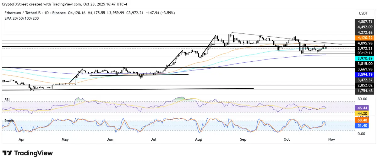 Ethereum Fiyat Tahmini: ETH, 4.100 USD'lik kritik seviyenin altına düştü, 100 günlük EMA'yı test ediyor.