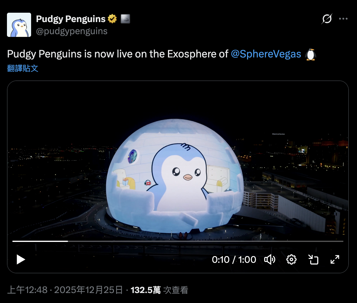 During the 2025 Christmas holiday season, the well-known NFT brand Pudgy Penguins successfully launched at the Las Vegas landmark Sphere, projecting its iconic penguin image onto the massive Exosphere spherical screen.