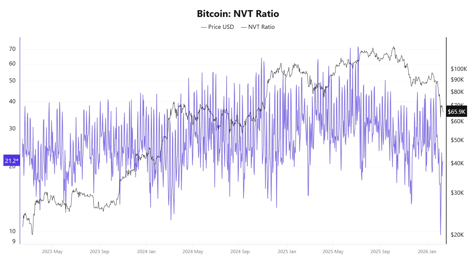 The NVT ratio, dubbed “crypto PE ratio,” divides network value by daily on-chain transaction volume. A high NVT suggests overvaluation; a low NVT suggests undervaluation.