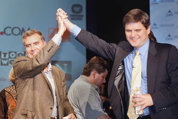 In January 2000, Time Warner CEO Gerald Levine (left) and AOL CEO Steve Case announced a merger that marked the pinnacle of the Internet boom.