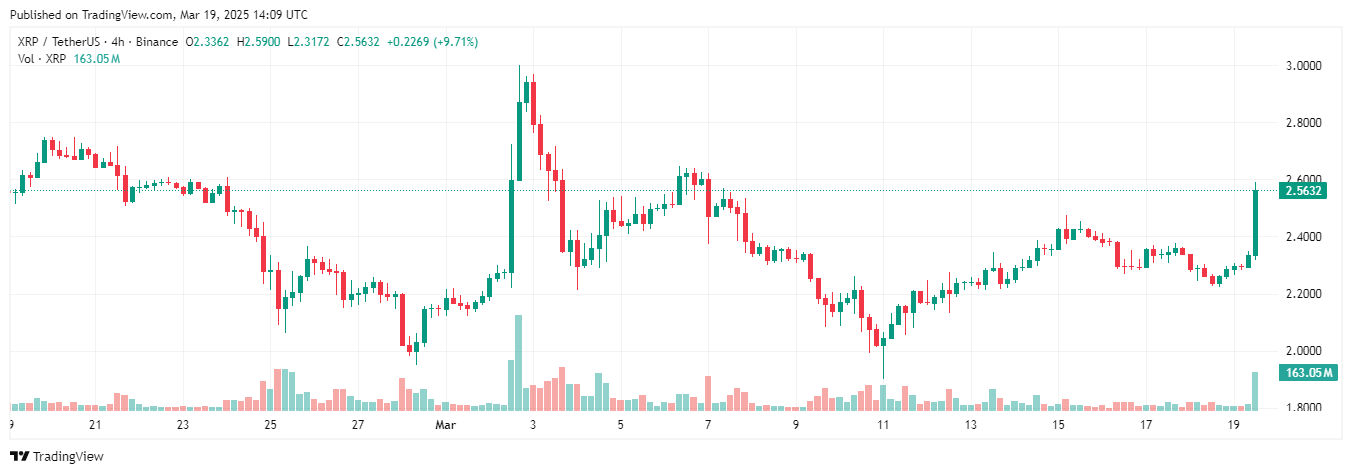 TradingView’den elde edilen veriler, kripto piyasasının bu gelişmeye olumlu tepki verdiğini gösteriyor. XRP’nin fiyatı 24 saatlik zaman diliminde %14’ten fazla arttı ve şu anda 2,56 dolardan işlem görüyor.