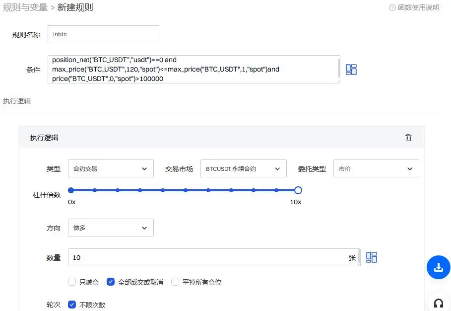 position_net(“BTC_USDT”,“usdt”)>0 ve min_price(“BTC_USDT”,1440,“spot”)>=min_price(“BTC_USDT”,1,“spot”)ve position_net(“BTC_USDT”,“usdt”)>0 ve max_price(“BTC_USDT”,6,“spot”)>max_price(“BTC_USDT”,5,“spot”)ve position_avg_open_price(“BTC_USDT”,“usdt”)*1.02 < index_price(“BTC_USDT”,0,“usdt”)ve position_net(“BTC_USDT”,“usdt”)>0 ve position_avg_open_price(“BTC_USDT”,“usdt”)*0.98>index_price(“BTC_USDT”,0,“usdt”)