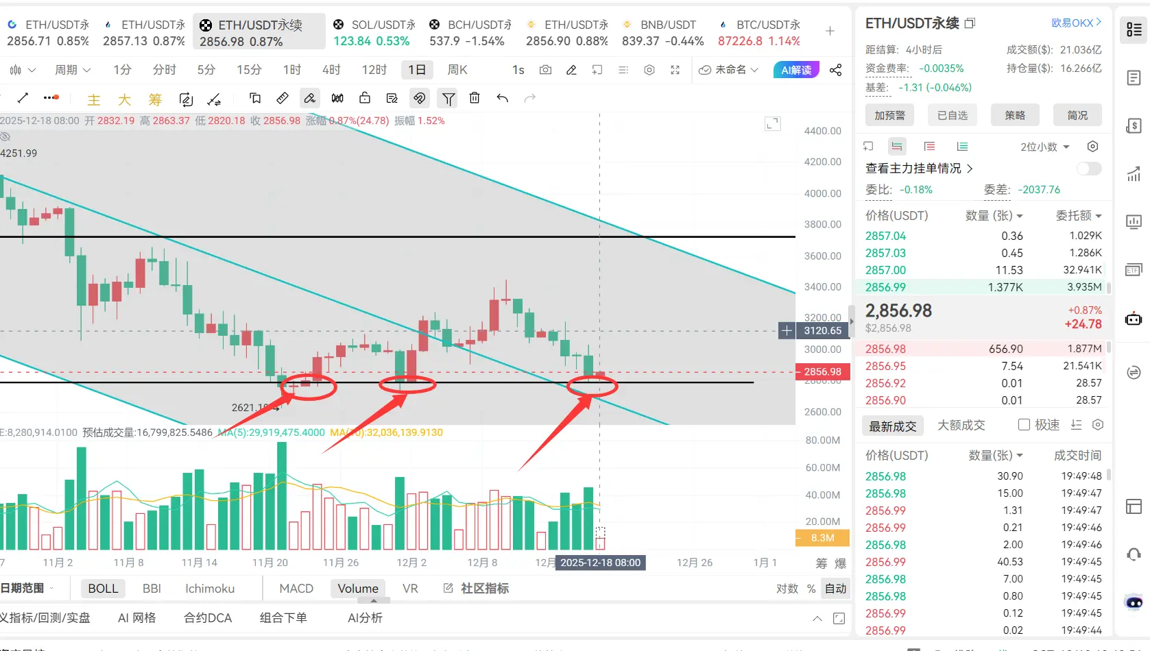 ETH: Compared to Bitcoin, Ethereum appears weaker. The 3000-3030 range has been a persistent barrier, and the rebound below 2780 has lacked volume. If Bitcoin weakens again, Ethereum will return to the 2780-2680 range.