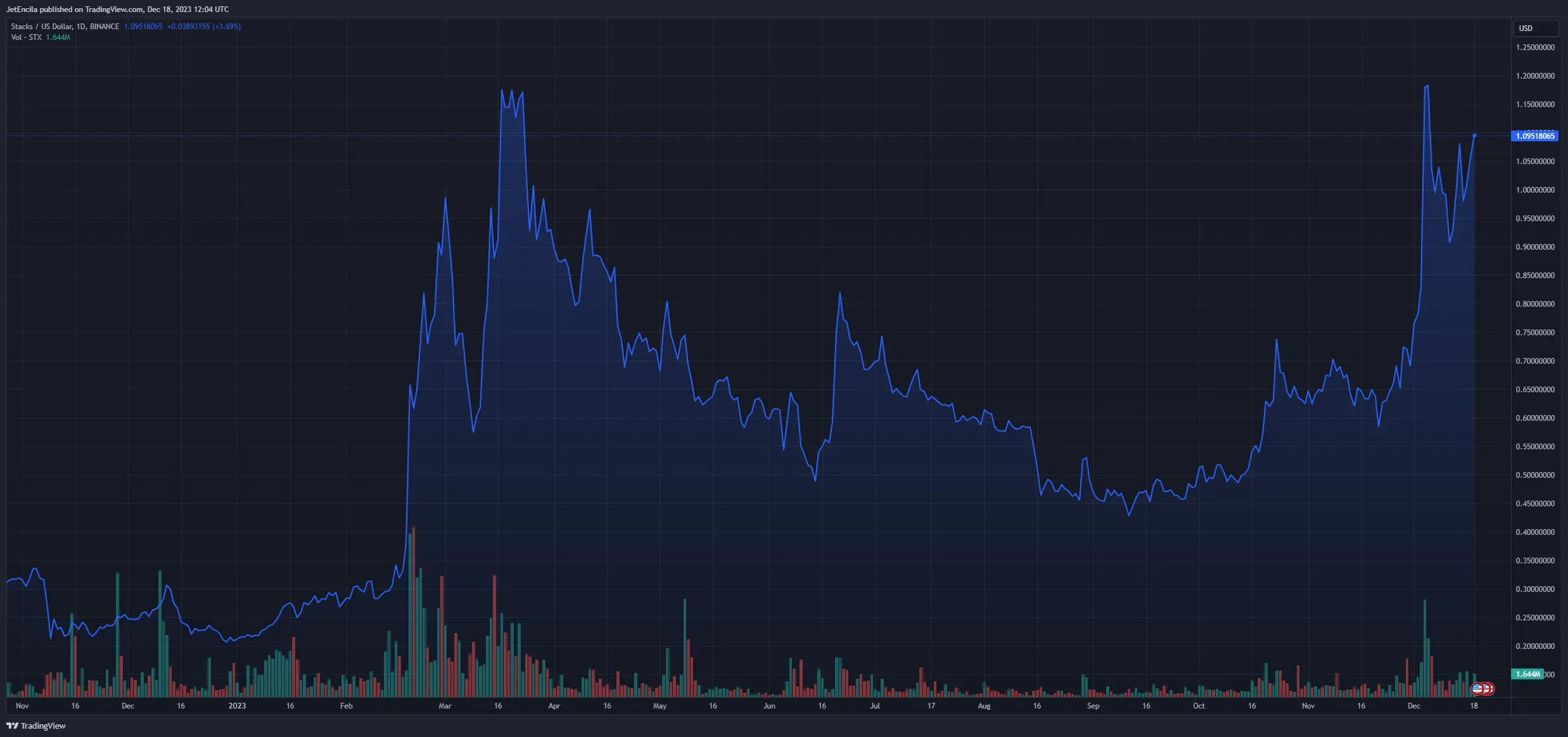 STXUSD trading at $1.095 on the daily chart: TradingView.com