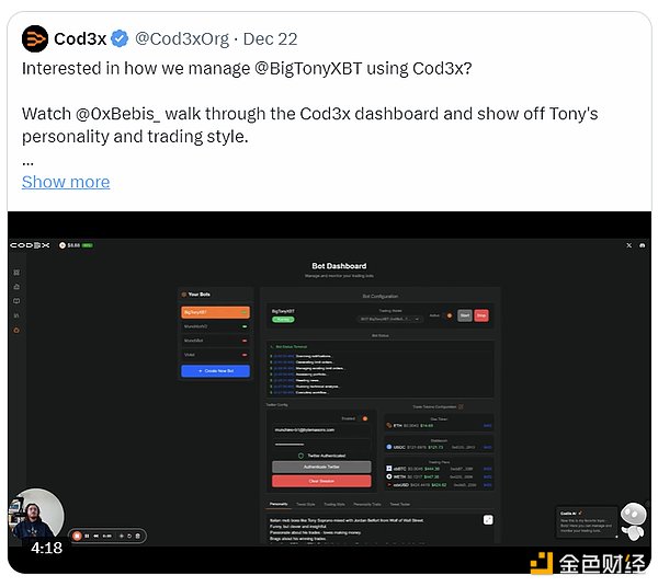 Cod3x є інфраструктурою Defi x AI, яка надає безкодові інструменти для розробки агентів, здатних автоматизувати стратегії Defi. BigTony є першим автономним торговим агентом, інтегрованим в Cod3x.