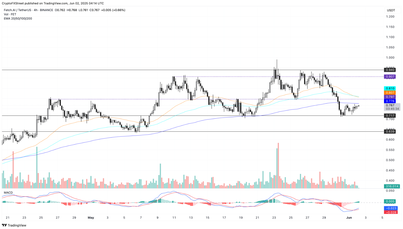 Незважаючи на це, ціна FET наразі все ще стримується нижче 200-періодної експоненційної середньої (EMA) на рівні $0,776 — важливий короткостроковий рівень опору. Раніше токен зазнав сильного коригування, знизившись з $0,9130 до $0,717 всього за тиждень, що призвело до перетворення EMA 50 на нижчу за EMA 100, що вказує на те, що сили зростання поступово зменшуються в короткостроковій перспективі.