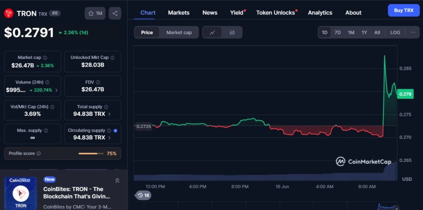 Ця заява викликала миттєву реакцію ринку. Ціна TRX зросла на 2,3%, майже досягнувши $0,28. Обсяг торгів злетів на 220%, наблизившись до $1 млрд.