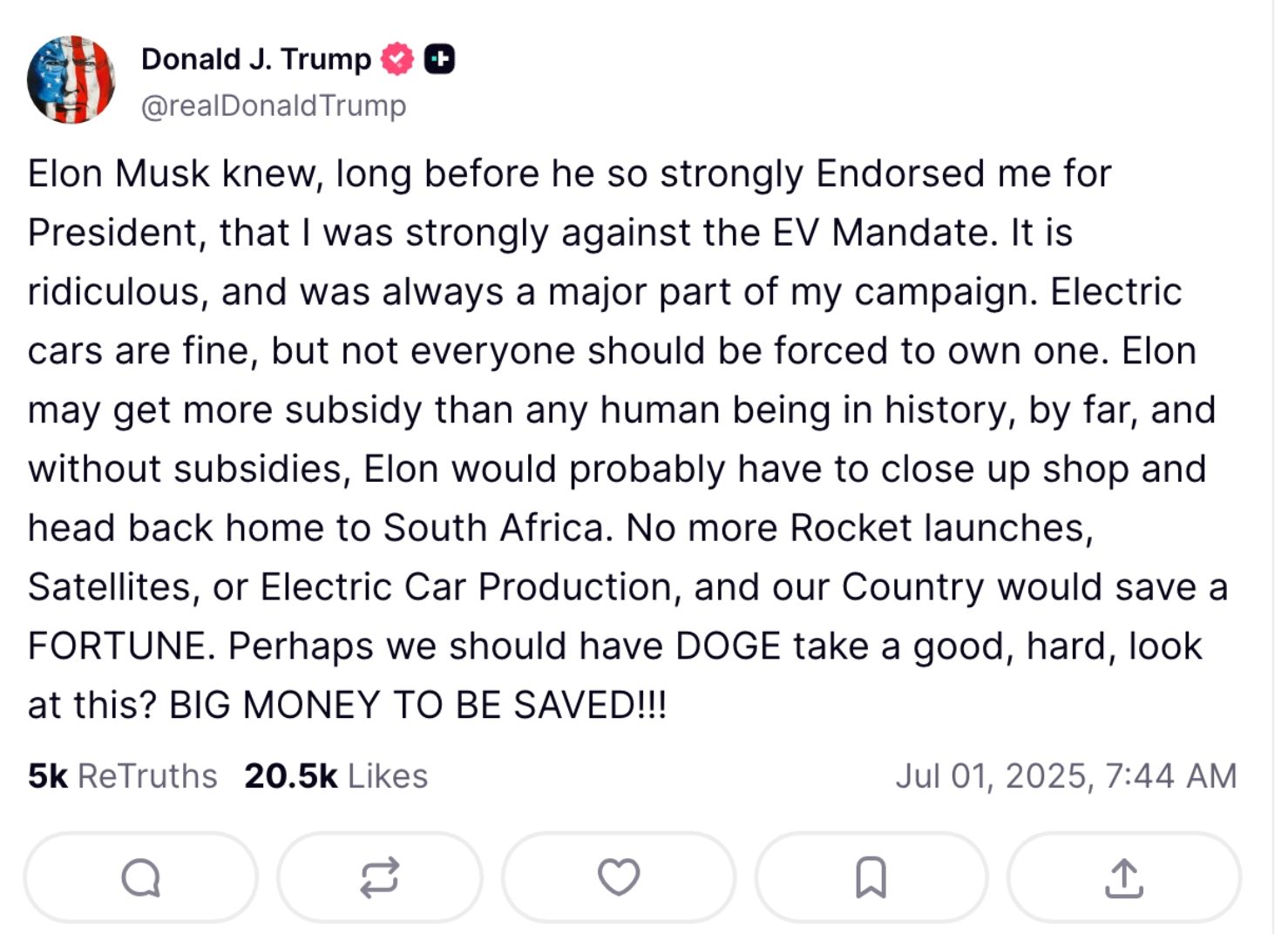 • Відповідь Трампа: Трамп звинуватив Маска, заявивши, що той знав про його опозицію до субсидій на електромобілі ще тоді, коли отримував його підтримку. Трамп навіть погрожував скоротити фінансування для іншої компанії Маска SpaceX (яка має величезні державні контракти).