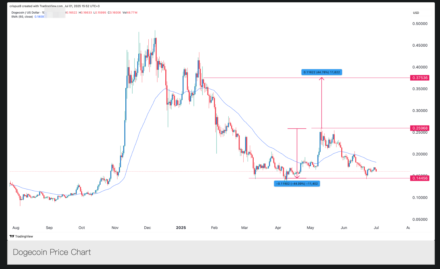 1. Підтвердження форми: Ціна двічі отримала сильну підтримку поблизу 0.1445 долара, сформувавши два чітких мінімуму.