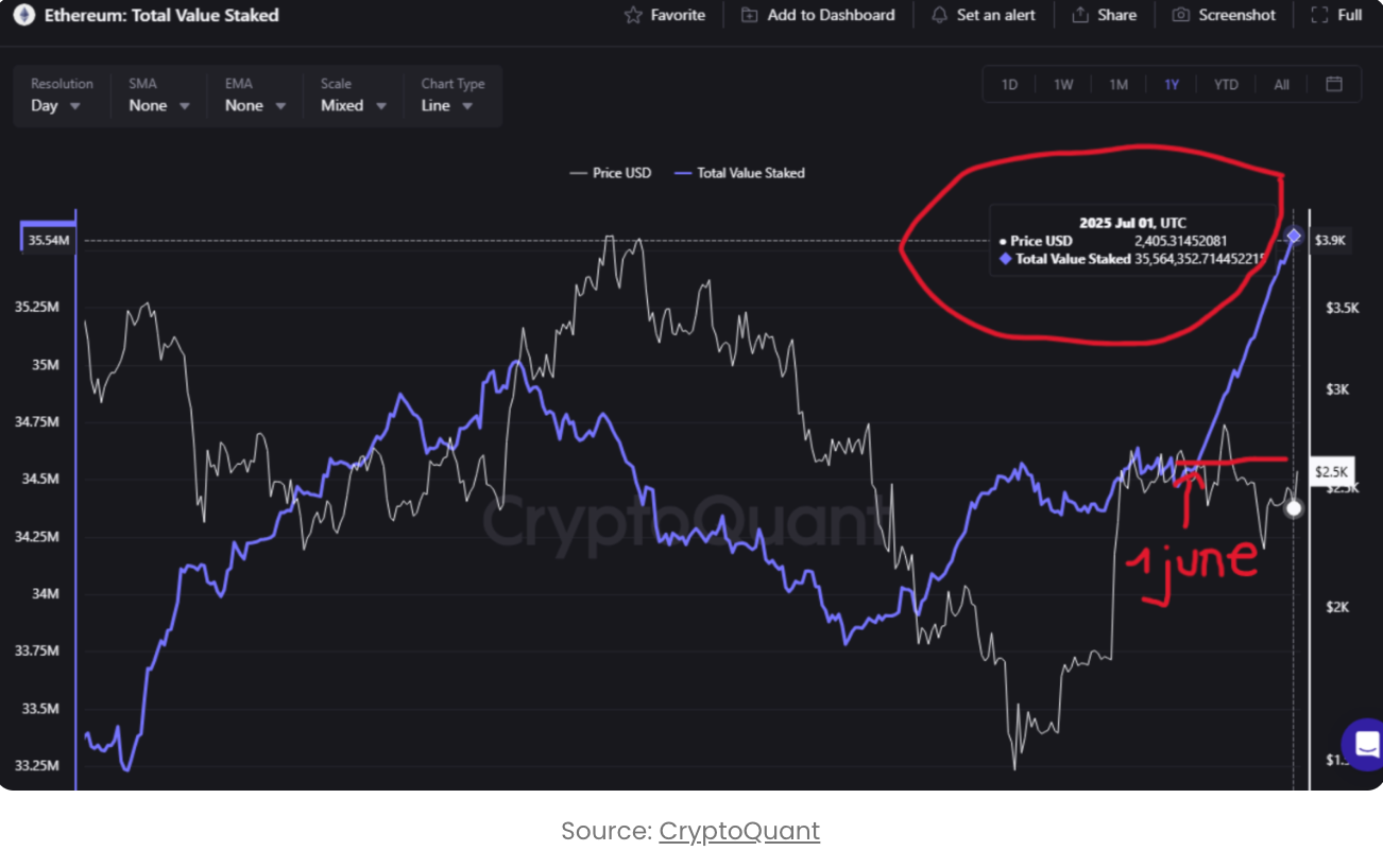 Згідно з аналізом аналітика CryptoQuant Кармело_Алемана, з 1 червня ліквідний стейкінг Етера істотно зріс. Загальна кількість застейканих ETH зросла з 34,54 мільйонів до 35,52 мільйонів на 30 червня — за короткий місяць додалося майже мільйон ETH.
