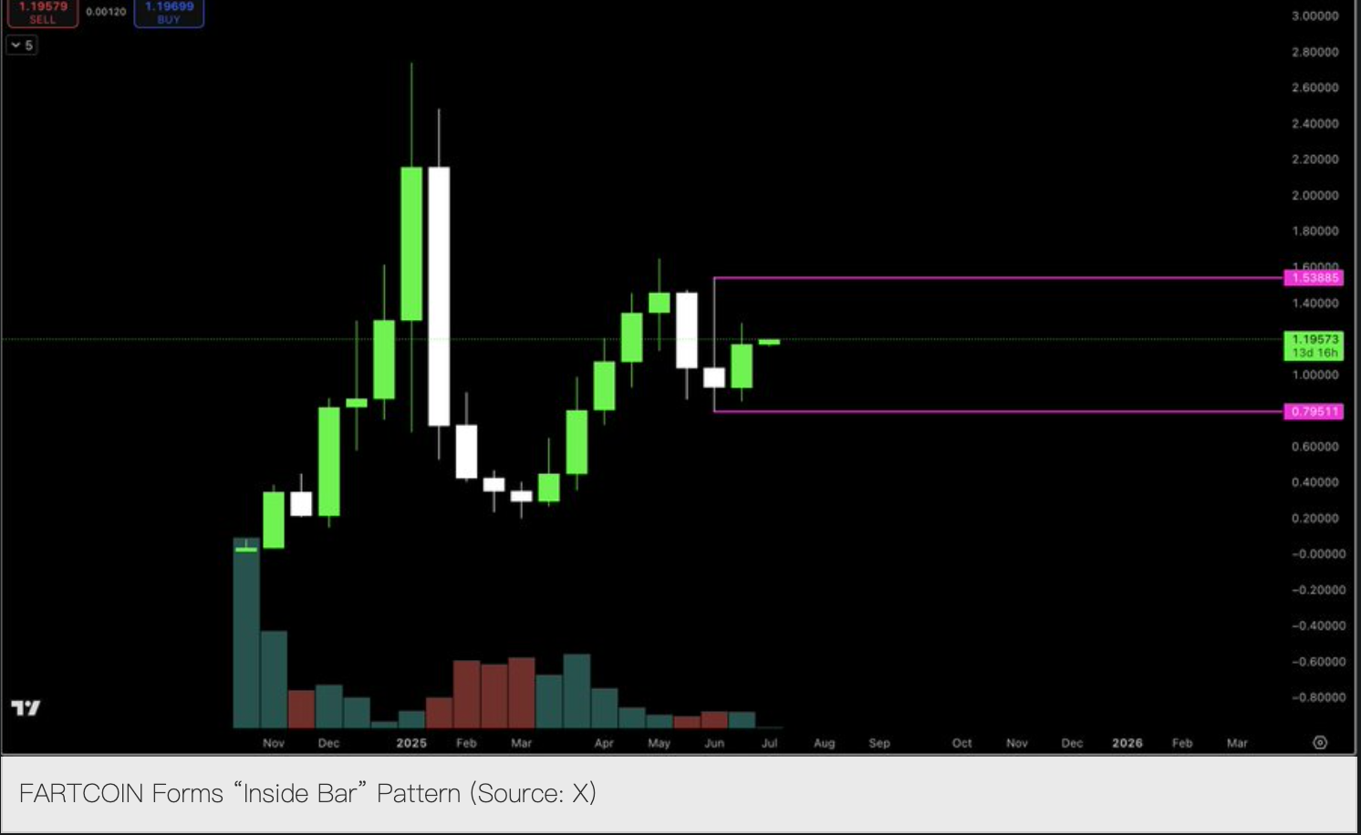 Аналітики CRG підкреслюють, що внутрішня бичача формація зазвичай з’являється після періоду невизначеності на ринку, що свідчить про наближення напрямкового прориву. Ця формація складається з однієї свічки, повністю включеної в ціновий діапазон попередньої “материнської свічки” (Mother Bar). Щодо $FARTCOIN: