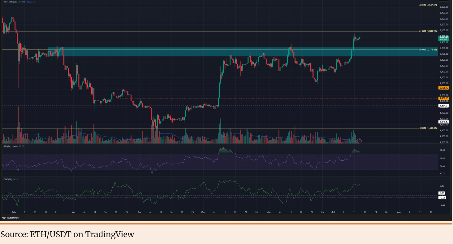 Зосереджуючись на короткостроковому аналізі 12-годинного графіка Ethereum, можна помітити, що ціна під час зростання в липні не зазнала достатньої консолідації в зоні спротиву $2,800. Це додатково підсилює можливість невеликого відкату ціни до цієї зони попиту, після чого можна сподіватися на новий раунд зростання. Наразі показник RSI (індекс відносної сили) становить 77, що свідчить про сильний короткостроковий бичачий імпульс. Проте слід бути обережними, оскільки в найближчі кілька днів може виникнути медвежа дивергенція, що стане короткостроковим ризиковим сигналом для трейдерів. З іншого боку, CMF (індикатор грошового потоку Чайкіна) становить +0.23, значно перевищуючи поріг у +0.05, чітко вказуючи на те, що значні кошти продовжують надходити на ринок, а тиск купівлі домінує. Ця потужна підтримка з боку капіталу може допомогти Ethereum швидко подолати ключовий психологічний рівень спротиву в $3,000.