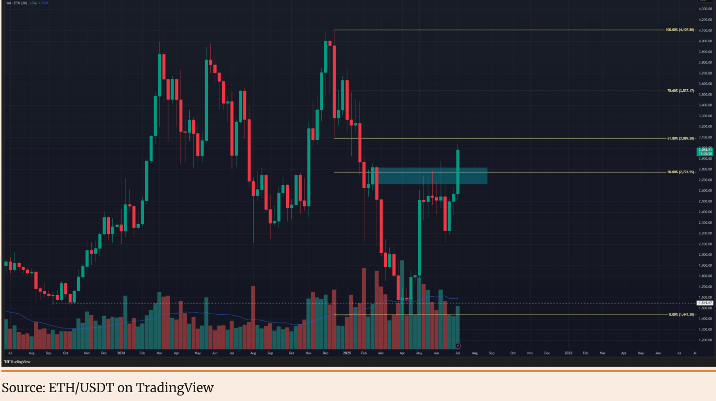 Якщо подивитися на тижневий графік Ethereum, то можна побачити, що ціна сильно пробила блок пут-ордерів (позначений блакитним кольором), розташований в районі $2 800. Ця проривна дія підкреслює сильні бичачі настрої на ринку та бажання покупців увійти на ринок. Однак це також означає, що свінг-трейдерам може знадобитися терпляче чекати, поки ціна проведе тест назад до рівня підтримки в 2 800 доларів, перш ніж розглядати можливість відкриття довгої позиції. Стрімке зростання тижневого рівня залишило ціновий розрив (Gap) нижче, і з точки зору Теорії розриву технічного аналізу, цей розрив ** необхідно подолати до наступного раунду підтягування.