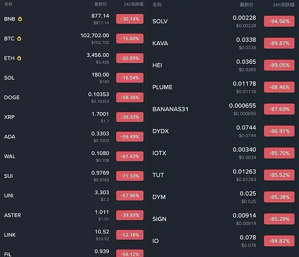 今年同样如此。自 10 月 11 日那场「黑色星期五」暴跌后,美股、黄金、比特币几乎同步跳水。纳斯达克下跌 3.5%,标普回落 2.8%,黄金从每盎司 4,300 美元跌至 3,900 美元,比特币从 12.6 万美元高点跌破 10 万美元,总市值蒸发超万亿美元。