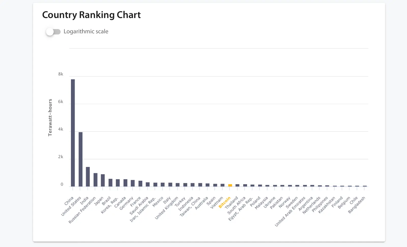 Лише Bitcoin, за оцінками, споживає від 150 TWh до 210 TWh електроенергії щорічно. Його енергоспоживання можна порівняти з багатьма країнами, такими як Південна Африка, Таїланд та ОАЕ, а також вдвічі перевищує споживання Фінляндії, Бельгії та Австрії. До того ж, щороку споживання електроенергії Bitcoin зростає приблизно на 25%, що підкреслює постійне зростання його енергетичних потреб.