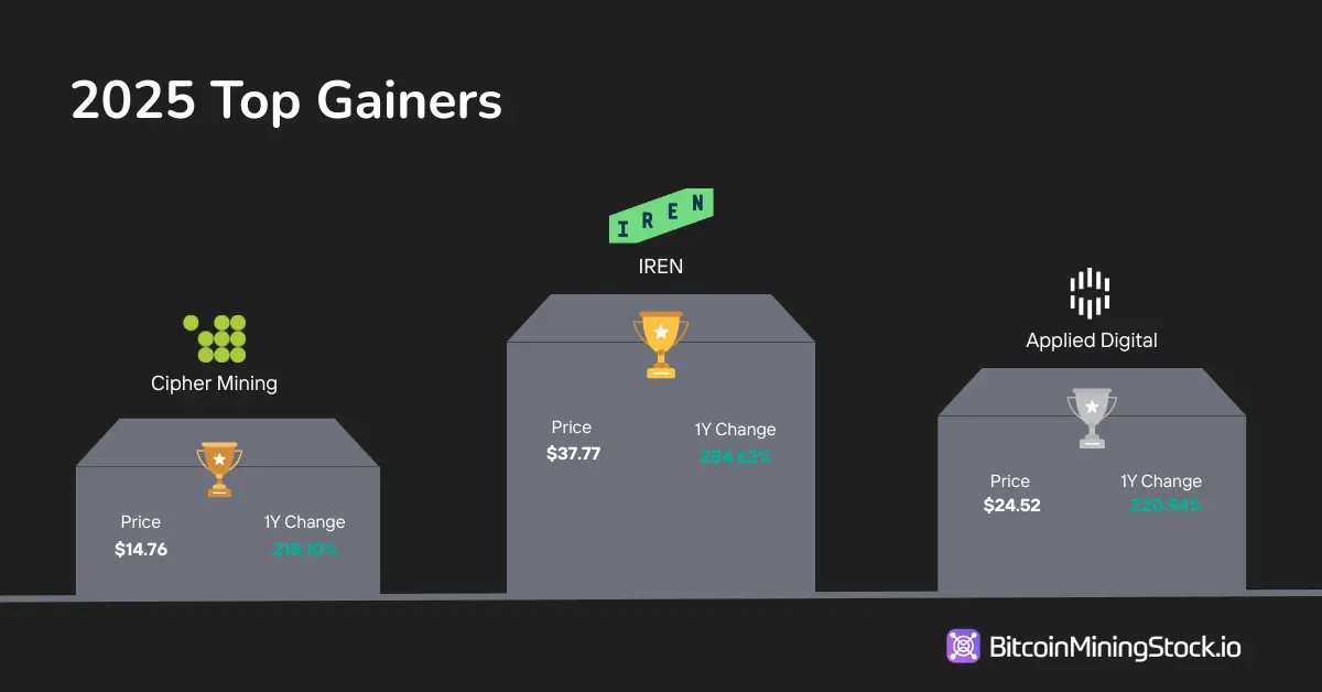 У 2025 році $IREN, $APLD та $CIFR ledли сектор майнінгу Біткоїна, кожен з яких приніс понад 200% доходу за 1 рік. Але більша історія прихована під лідерською дошкою: ринок чітко віддавав перевагу певним типам компаній протягом минулого року.