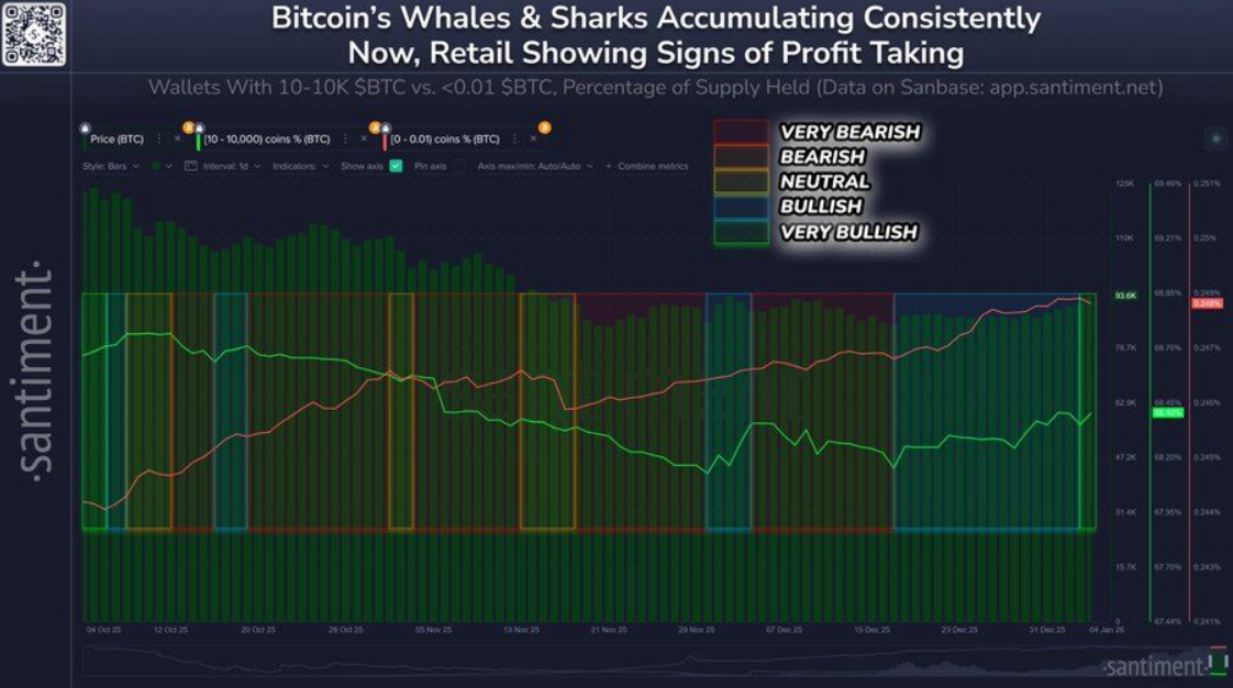 Дані on-chain останніх показують, що “кити” з володінням від 10 до 10 000 BTC тихо нарощують свої позиції значною мірою. З 17/12 ця велика група гаманців додала понад 56 000 Біткойнів, тоді як роздрібні інвестори мають тенденцію фіксувати прибутки після недавнього зростання. Ця протилежність у поведінці створює знайому картину ринку криптовалют: розумні гравці використовують момент для накопичення активів, коли тиск з боку роздрібних продавців зростає.