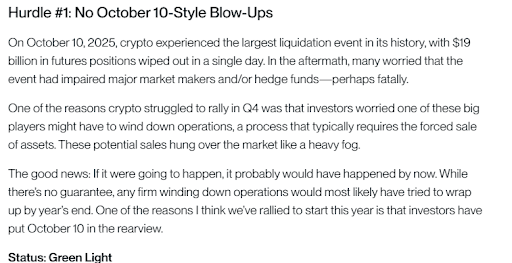 Bitwise зазначає, що ранній ралі у 2026 році сталося тому, що ці страхи нарешті зникають. Оскільки до кінця грудня жодна велика компанія не збанкрутувала, інвестори починають почуватися більш впевнено.