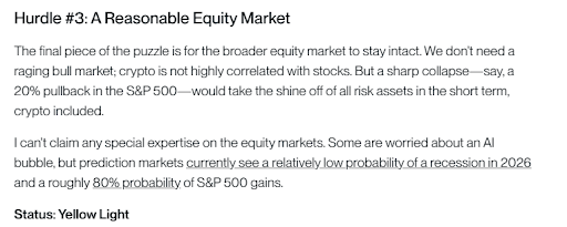 Мэтт Хоґан зазначив, що стабільний ринок акцій важливий для досягнення нових максимумів у криптовалюті. Зараз більшість прогнозних ринків оцінюють низьку ймовірність рецесії у 2026 році. Якщо S&P 500 продовжить свій стабільний шлях, це створить умови, за яких інвестори почуватимуться досить безпечно, щоб купувати цифрові активи.