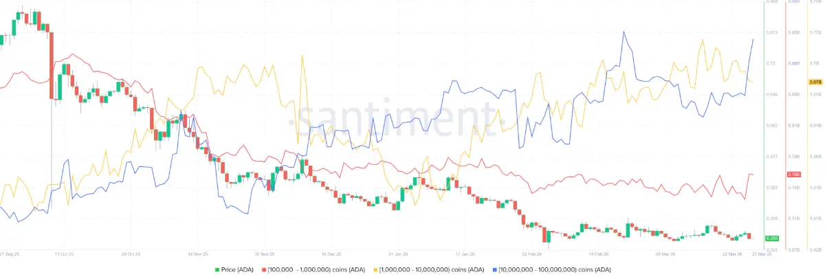 Хоча короткостроковий прогноз залишається негативним, дані on-chain від Santiment показують, що деякі групи китів почали повертатися до накопичення ADA. Зокрема, гаманці, які утримують від 100.000 до 1 мільйона ADA та від 10 до 100 мільйонів ADA, придбали в цілому 270 мільйонів токенів за період з середи по п’ятницю. На противагу цьому, група, що володіє від 1 до 10 мільйонів ADA, продала близько 20 мільйонів токенів.