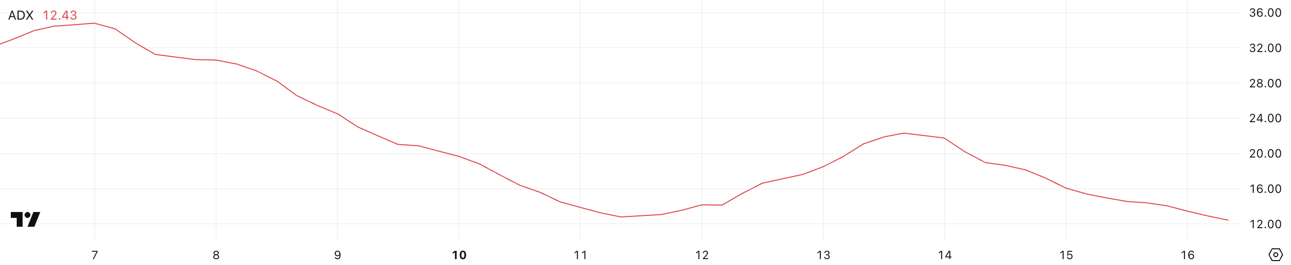 Середній індекс напрямку Солани (ADX) в даний момент становить 12,4, що менше, ніж 22,3 три дні тому. ADX вимірює силу тренду, де значення вище 25 вказують на сильний тренд, а значення нижче 20 вказують на слабкий або відсутній тренд.