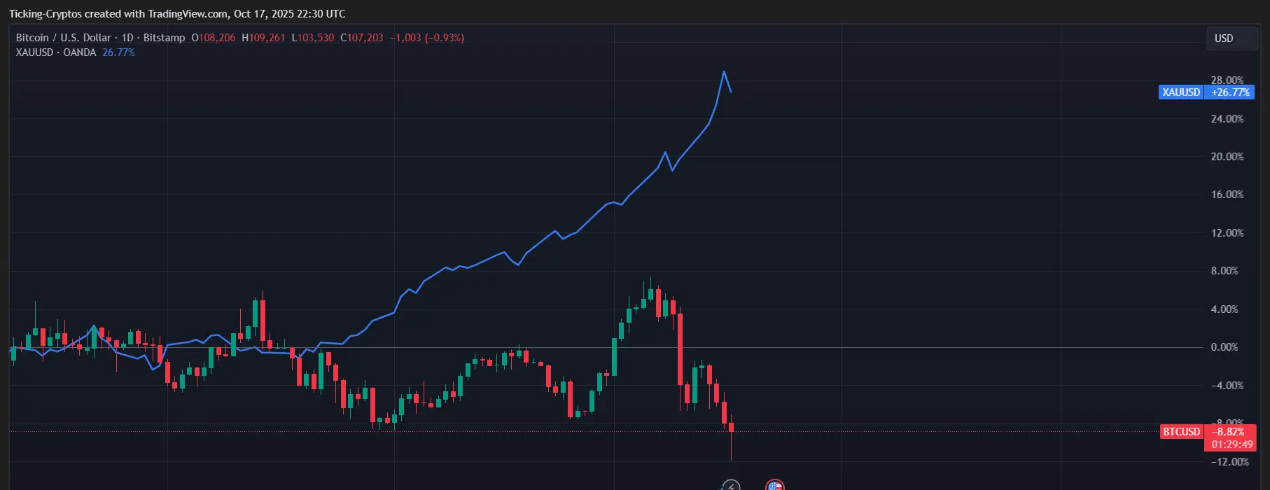 Динаміка ринку жовтня створила вражаючу картину: Біткоїн впав майже на 9% за останній місяць, перебуваючи небезпечно близько до психологічної позначки $100,000, в той час як Золото зросло до нового рекорду на рівні близько $4,300, здобувши приблизно 15% за той же період.