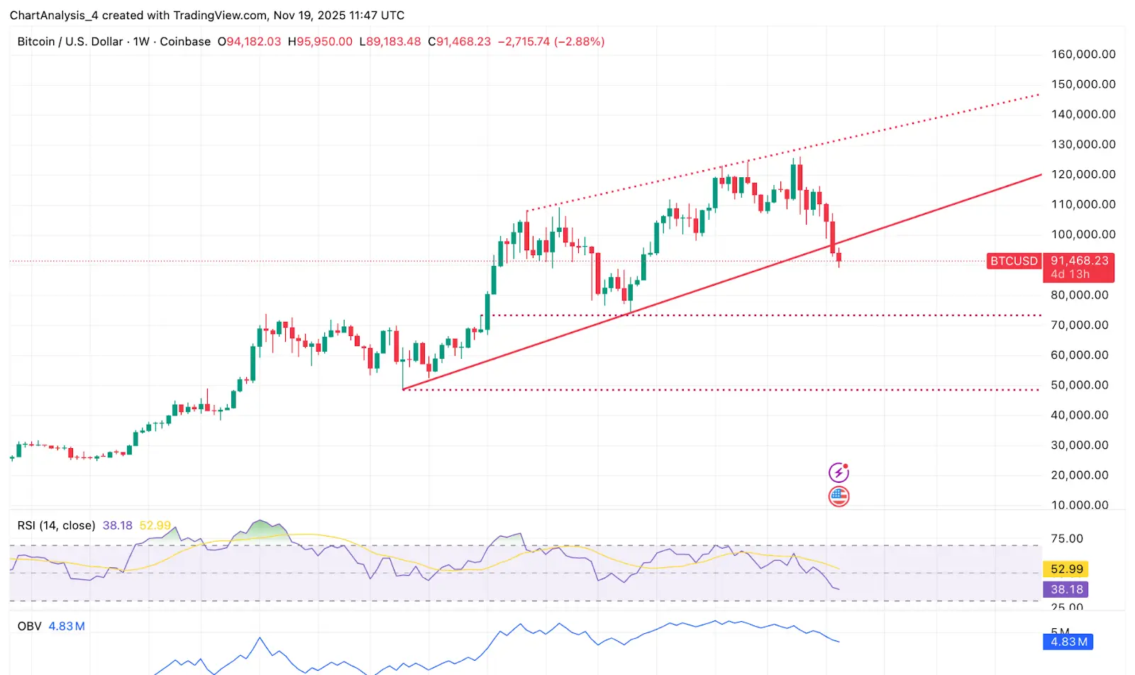 Тижневий графік показує, що Bitcoin порвав довгострокову висхідну лінію тренду, яка трималася більше року. Свічка закрилася рішуче нижче цієї лінії, яка раніше діяла як основа зростання з $60,000 до $130,000. Моментум послабився після подвійного максимуму в $130,000 у серпні, і ціна тепер повернулася до середини ширшого висхідного клину.