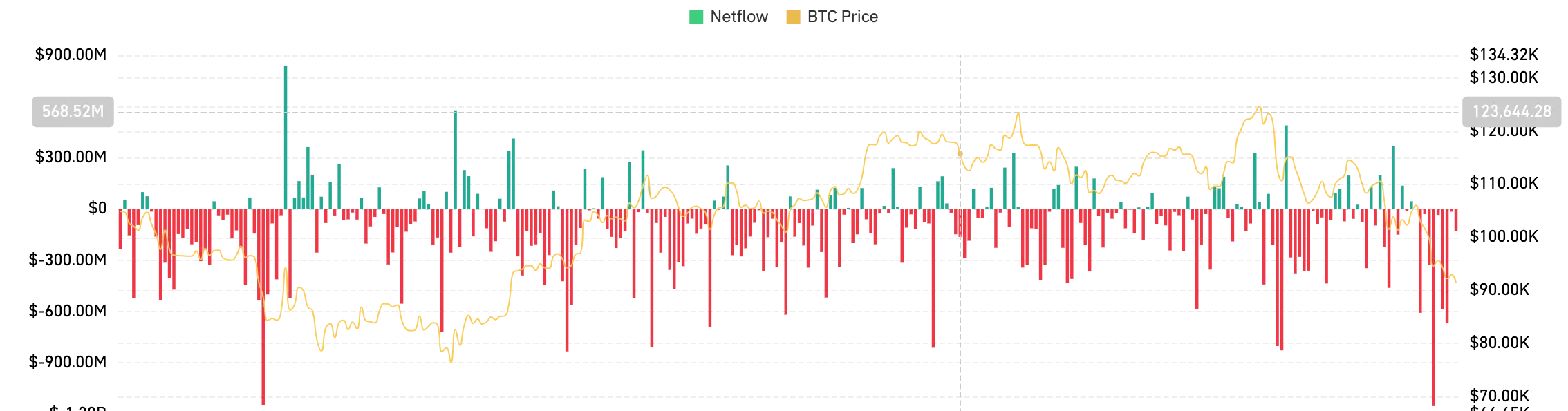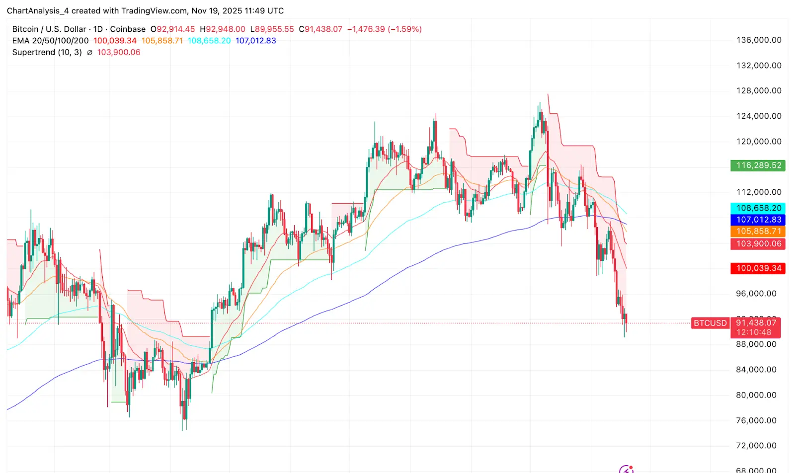 Сьогодні ціна біткоїна торгується близько $91,450 після того, як не змогла захистити багатомісячну трендову лінію, яка підтримувала кожен ріст з початку 2024 року. Пробиття змістило короткострокову динаміку чітко на користь продавців, оскільки спотові виводи прискорюються, а щоденні EMA переходять у надголовний опір.