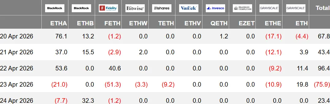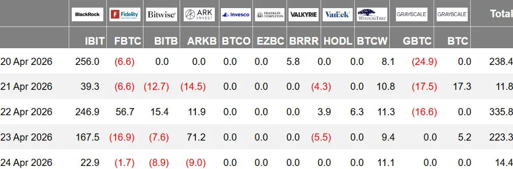 На 23 квітня загальний номінальний обсяг відкритих позицій Bitcoin фізичних ETF склав 24.14 мільярда доларів, співвідношення довгих і коротких позицій — 1.54.