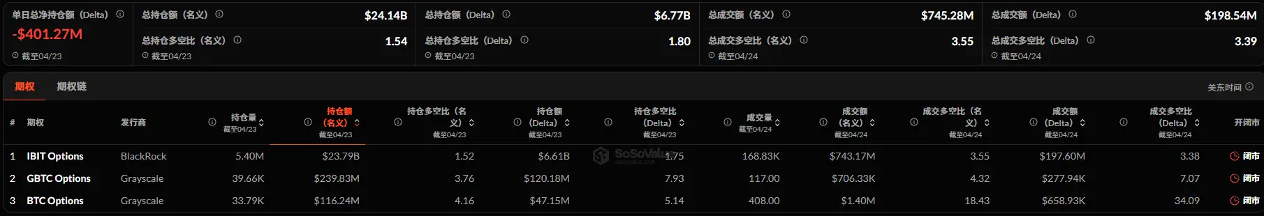 На 24 квітня загальний номінальний обсяг торгів Bitcoin фізичних ETF опціонів склав 745 мільйонів доларів, співвідношення між довгими та короткими позиціями — 3.55.