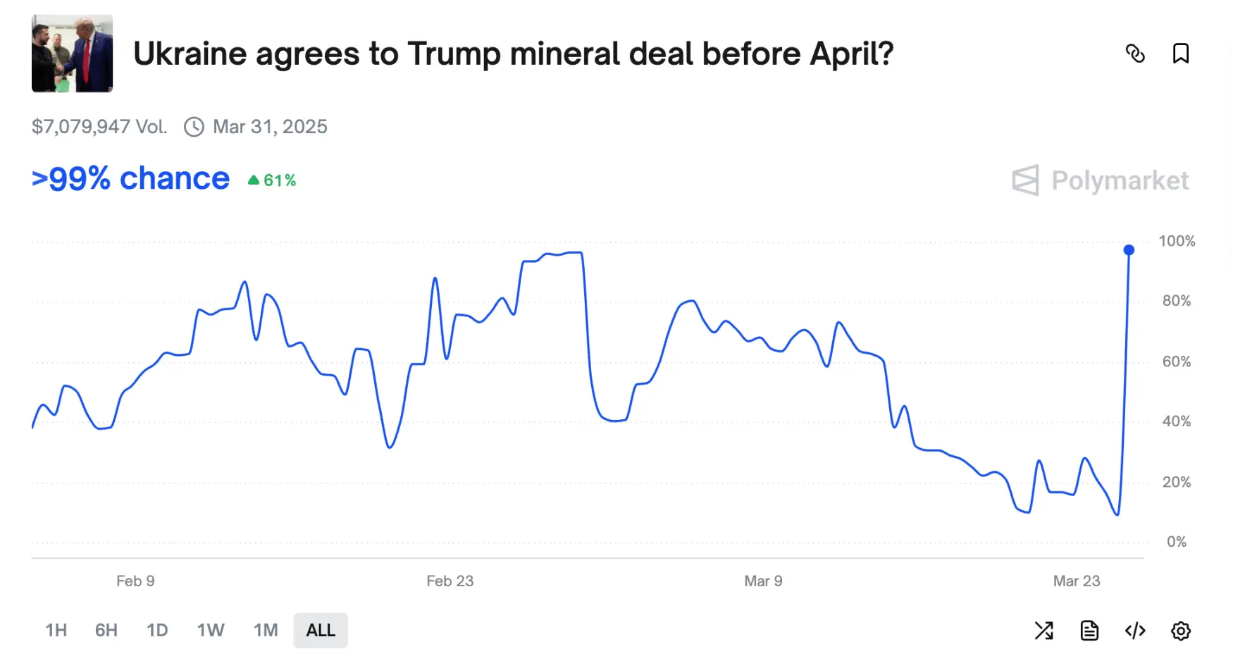 Ngày 25 tháng 3 năm 2025 theo giờ Bắc Kinh, trên Polymarket nổi tiếng về cuộc bầu cử tổng thống Mỹ, xảy ra vụ tấn công oracle. Trong thị trường “Ukraina có đồng ý với thỏa thuận khai thác của Trump trước tháng 4 không”, khi thời gian gần đến hạn chót, xác suất “Có” đã gần 0, nhưng đột nhiên vào tối ngày 25 tháng 3, xác suất này tăng vọt lên 100%.