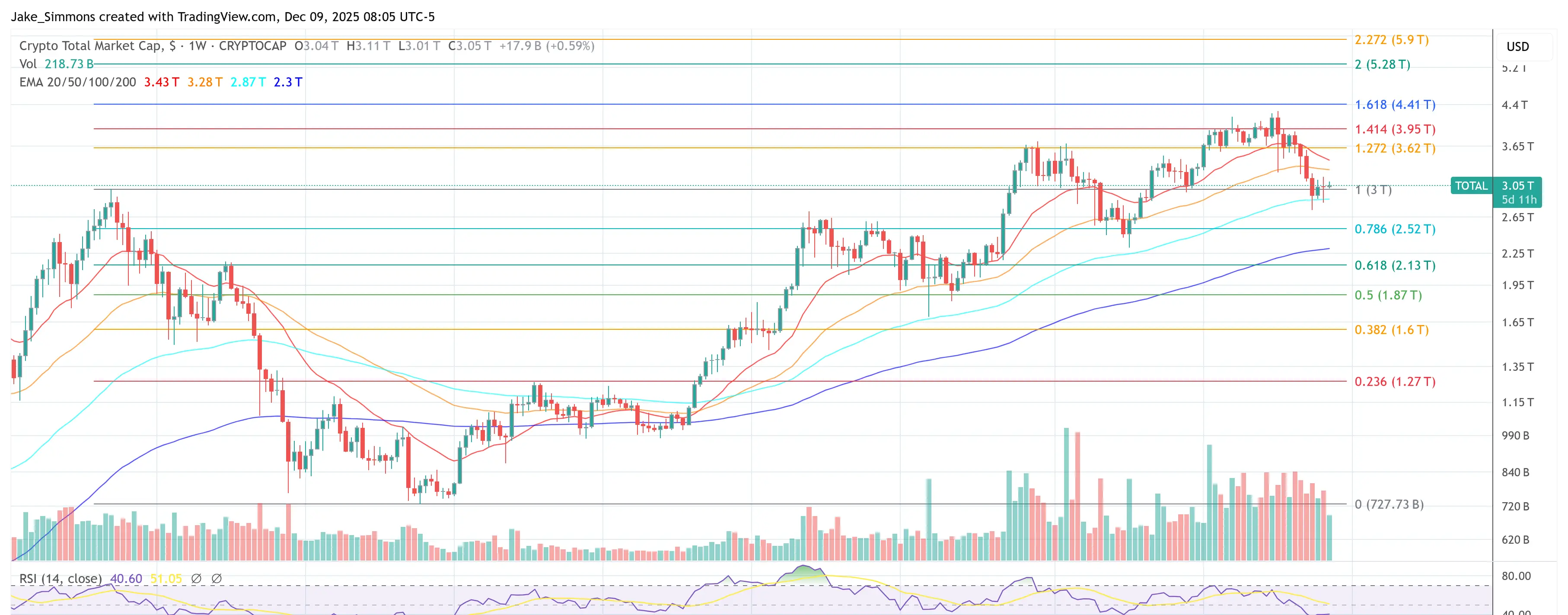 Tại thời điểm viết bài, tổng vốn hóa thị trường tiền điện tử đứng ở mức 3,05 nghìn tỷ đô la.