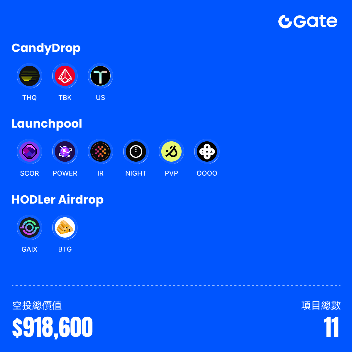 本週期 Gate 上線了 12 個新項目,2 個 CandyDrop 項目,6 個 Gate Launchpool 項目和 2 個 HODLer Airdrop 項目,累計空投總價值為 $918,600。